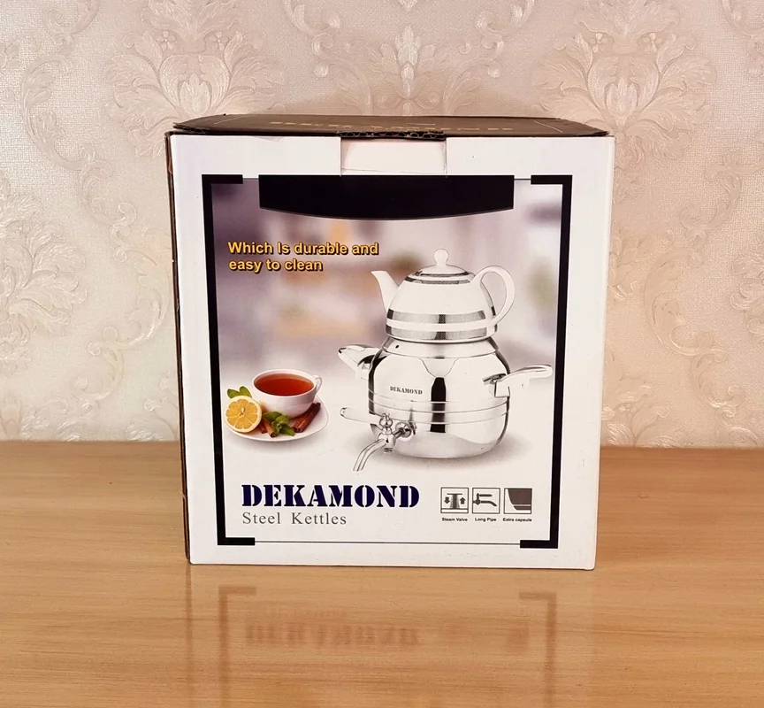 در دنیایی که همه در پی انجام دادن سریع تر کارها هستند , جای تعجب نداره که انواع چایساز ها و چای های کیسه ای طرفداران زیادی پیدا کرده باشند , اما هنوز هم هستند کسانی که کیفیت براشون اهمیت بیشتری داره و ترجیح میدن با دم کردن چایی روی شعله ملایم از عطر و طمع واقعی چایی لذت ببرن. چیزی که در چایسازها و چای های کیسه ای اتفاق نمیافته.کتری قوری استیل دکاموند یکی از اون محصولاتی هست که با کیفیت بالایی که داره با دم کردن یک چای خوش طمع و خوش عطر خاطره ی خوبی از نوشیدن چای براتون به جا میگذاره . کتری چهار لیتری تمام استیل شیردار با گنجایش مناسب و کیفیت بالای دسته ها , از جنس باکالیت نسوز , معرف خوبی از کتری قوری استیل دکاموند , محصول خوش ساخت و خوش قیمت میتونه باشه همچنین طراحی به روز قوری چینی این محصول و تناسب آن با بدنه کتری از دیگر نکات مثبت این محصول به شمار میاد. طراحی کتری این مصحول بسیار با دوام و مقاوم انجام شده و شما میتوانید روی گازهای الکترونیکی هالوژنی سرامیکی و ... از آن استفاده کنید همچنین استیل ضد زنگ آن از زود خنک شدن آب جوش جلوگیری میکند.قوری چینی این محصول نیز با طراحی زیبا سایز دهانه مناسب و فیلتر قابل جدا شدن آن در طعم چایی تاثیر زیادی دارد و همچنین کار را برای شستشو و تمیز کردن راحت میکند.